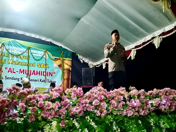 Senori – Brigadir Miftahul Aulidia Wicaksana, anggota Polsek Senori Polres Tuban Polda Jatim yang sehari-hari bertugas sebagai Bhabinkamtimas Desa Sendang menghadiri kegiatan pengajian umum yang diselenggarakan oleh pengurus mushola Al Mujahidin Desa Sendang Kecamatan Senori, Minggu (7/9/2025) malam.