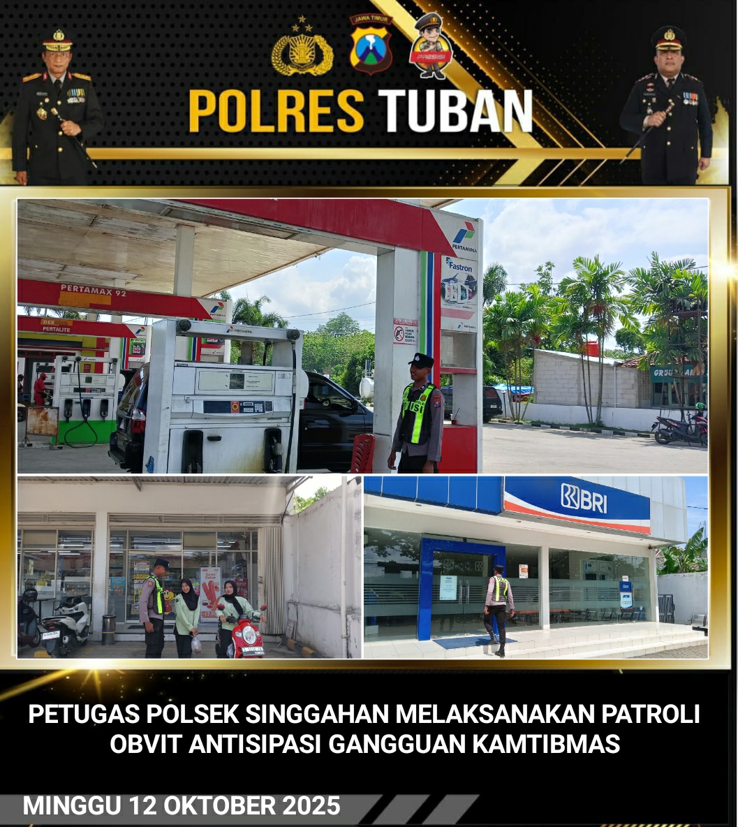 Guna mengecek kuota BBM agar tidak terjadi kelangkaan, Personil Polsek Singgahan Polres Tuban Polres Tuban melaksanakan patroli dengan sasaran SPBU desa Lajolor Kecamatan Singgahan Kabupaten Tuban. Senin (13/10/2025).