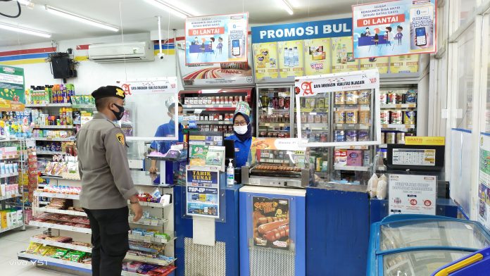 Petugas Patroli Juga Menghimbau Pengunjung Minimarket yang Sedang Beristirahat dari Perjalanan agar tetap lakukan Physical Distancing Jaga Jarak antar sesama, Gunakan Masker Jika berada diluar Rumah serta Senantiasa Jaga Protokol Kesehatan guna memutus mata rantai Penyebaran virus Covid-19.
