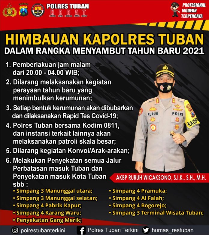 wacananews.com – PolresTubanPoldaJatim Kepala Kepolisian Resor Tuban AKBP Ruruh Wicaksono, S.I.K., S.H., M.H., mengeluarkan Imbauan kepada masyarakat dalam rangka menyambut datangnya tahun baru 2021.
