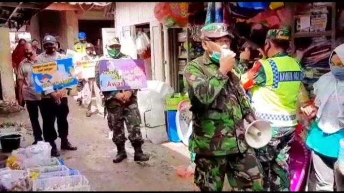Kegiatan sosialisasi dilanjutkan dengan blusukan ke dalam pasar untuk mendisiplinkan warga agar mentaati protokol kesehatan dengan cara memberikan teguran secara humanis kepada pengunjung pasar yang diketahui tidak menggunakan masker.