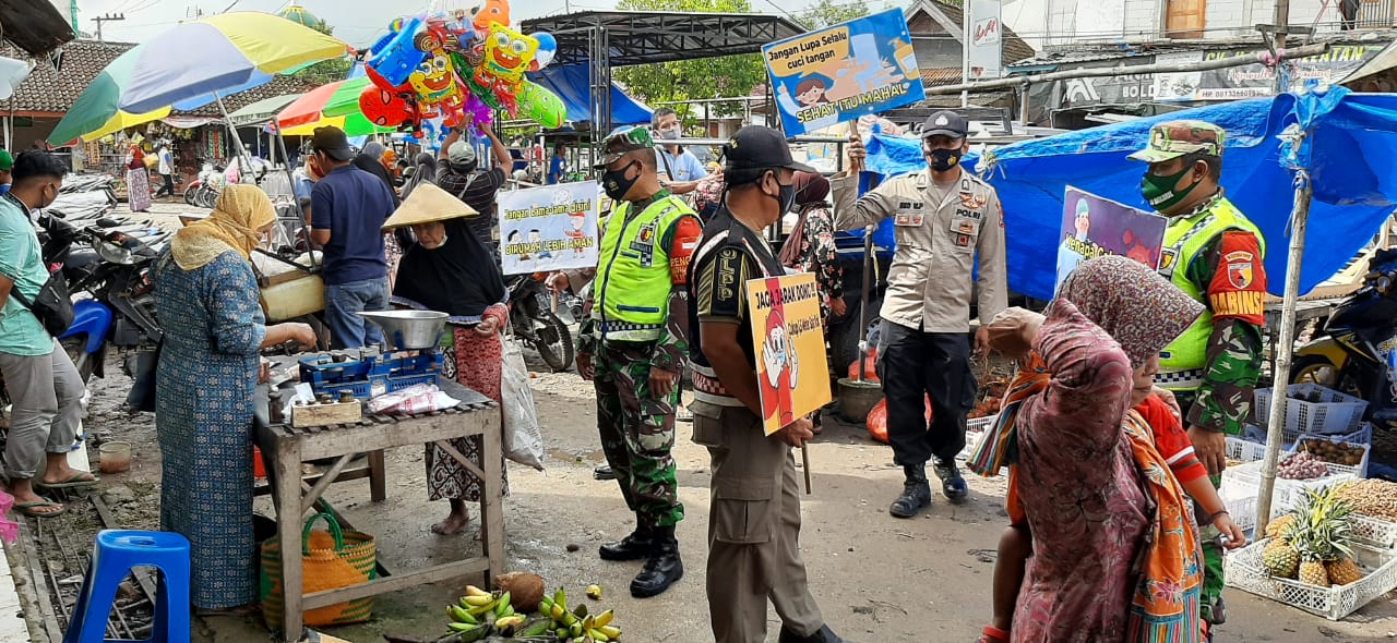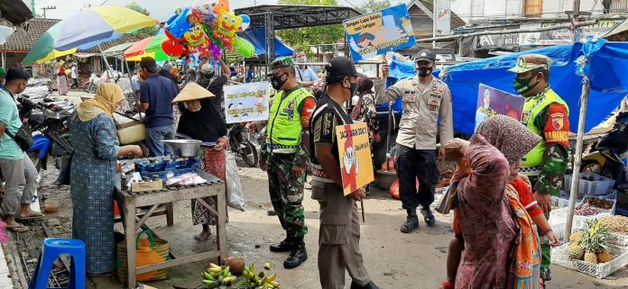 Dipimpin oleh Ps, Kanit Provost Polsek Senori Polres Tuban Aipda Ahmadi bersama Batituud Koramil Senori Peltu Mahmudi, anggota gabungan memberikan sosialisasi tentang cara pencegahan dan pengendalian wabah pandemi Covid-19 dengan mengajak pengunjung pasar untuk disiplin melaksanakan protokol kesehatan.