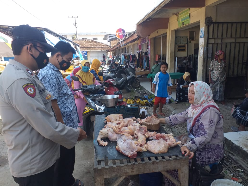 Terlihat di pasar tradisional Desa Jatisari Kecamatan Senori, Aiptu Karsojo bersama anggota memeriksa ketersediaan bahan pokok seperti beras, daging, Telor dan bahan pokok lainya. Hal tersebut dilakukan untuk mengetahui harga yang di jual di pasaran.