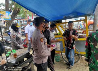 Anggota Polsek Tuban patroli protokol kesehatan di kerumunan warga.