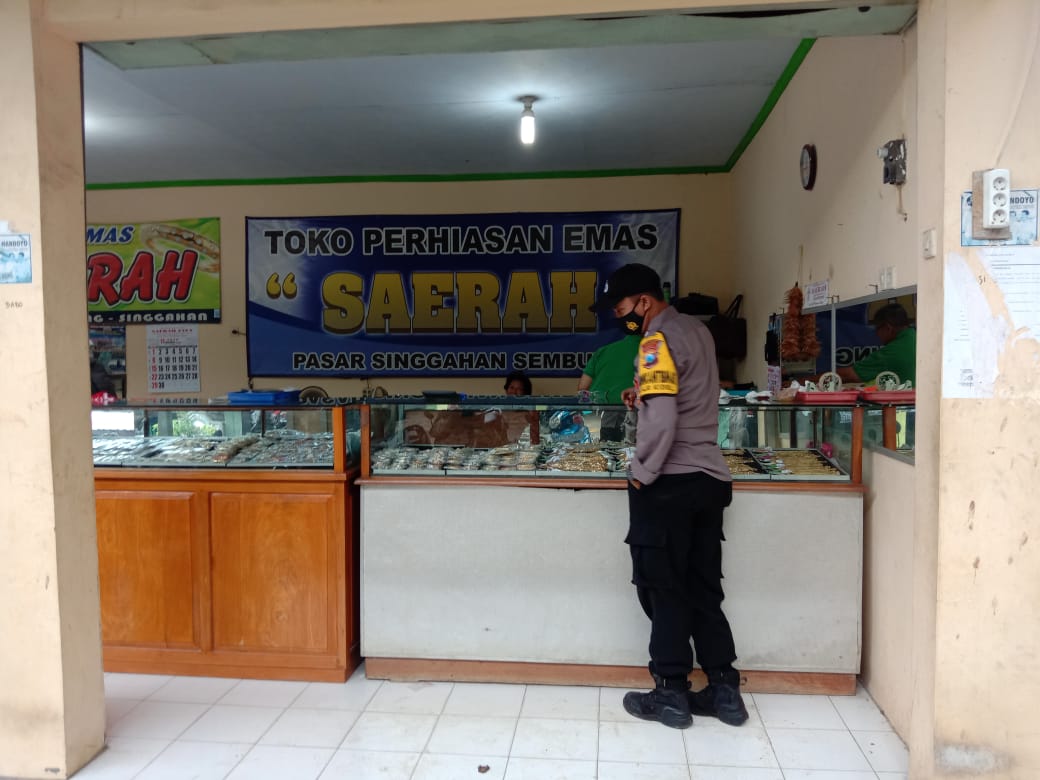 Kali ini terlihat personel Polsek Singgahan Polres Tuban melaksanakan patroli dengan menyambangi toko emas di areal pasar Desa Tinggulrejo Kecamatan Singgahan Kabupaten Tuban. Rabu siang (19/5/21)