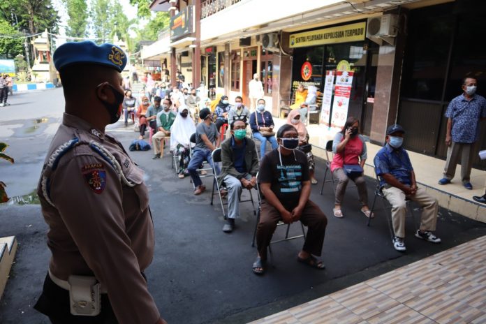 Kegiatan vaksinasi massal di laksanakan di loby Mapolres Lumajang, Kamis (17/6/2021). Dalam pelaksanaannya, protokol kesehatan (prokes) diterapkan secara ketat.