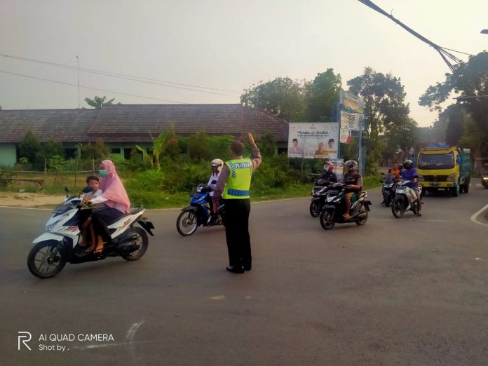 Terlihat di SP4 ringroad Samanding, anggota melaksanakan pengaturan lalu lintas menyeberangkan masyarakat yang sedang beraktifitas di pagi hari.