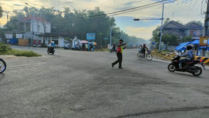 Terlihat di SP4 ringroad Samanding, anggota melaksanakan pengaturan lalu lintas menyeberangkan masyarakat yang sedang beraktifitas di pagi hari.