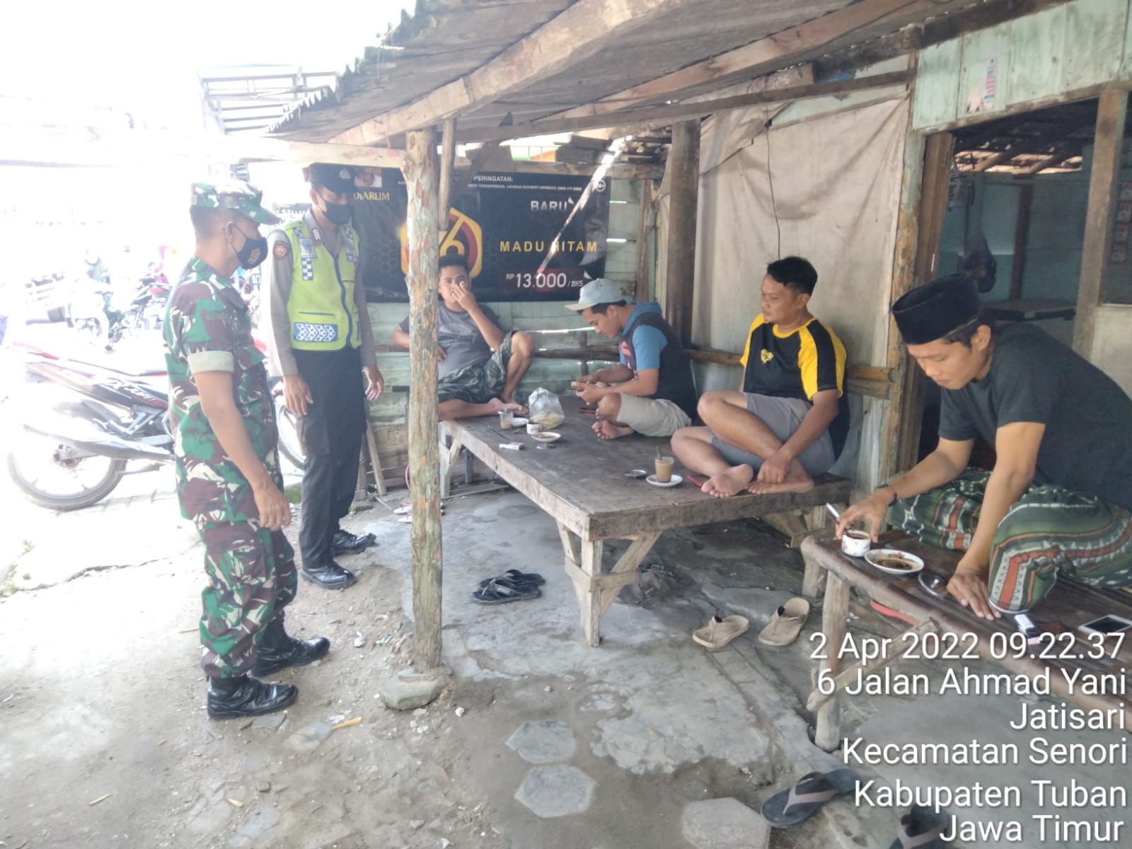 Senori – Lagi asyik-asyiknya ngopi sambil bercengkrama, sekelompok warga di Desa Jatisari Kec, Senori kaget karena tiba-tiba di datangi oleh tim gabungan dari Polsek Senori Polres Tuban, Koramil Senori dan Satpol PP Kecamatan Senori, Sabtu (2/4/2022) siang.