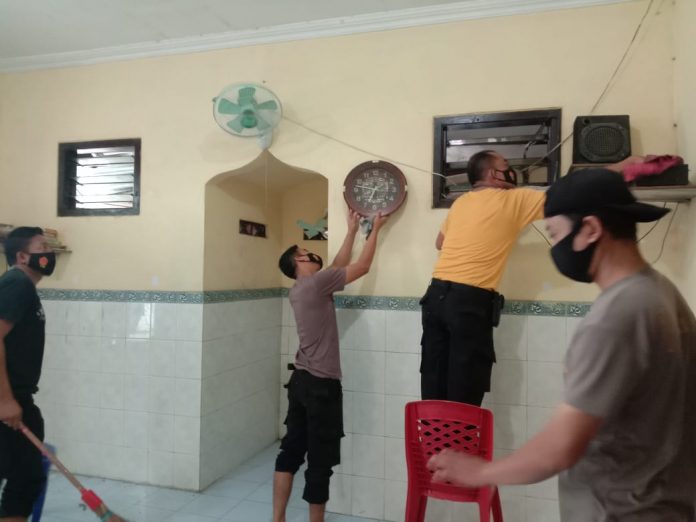 Diawali dengan membersihkan langit langit, sela sela lubang sirkulasi udara, dinding kaca dan yang lainnya, Anggota kemudian membersihkan lantai tempat ibadah dengan cairan disinfektan.