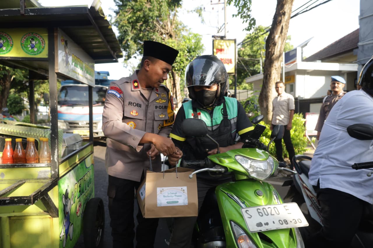 Dengan penuh keakraban, Kapolres bersama jajaran turun langsung ke jalan menyapa para pengendara roda dua maupun roda empat serta masyarakat yang melintas, sembari menyerahkan paket takjil untuk berbuka puasa.