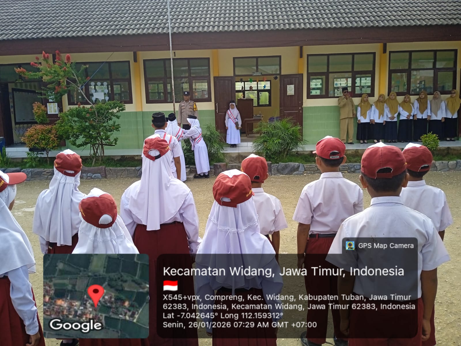 Tuban – Pukul 07.00 Wib bertempat di SD Negeri Compreng Kecamatan Widang Tuban Jawa Timur,  Kanit Binmas Polsek Widang Bripka Karjono melaksanakan kegiatan upacara bendera hari Senin.