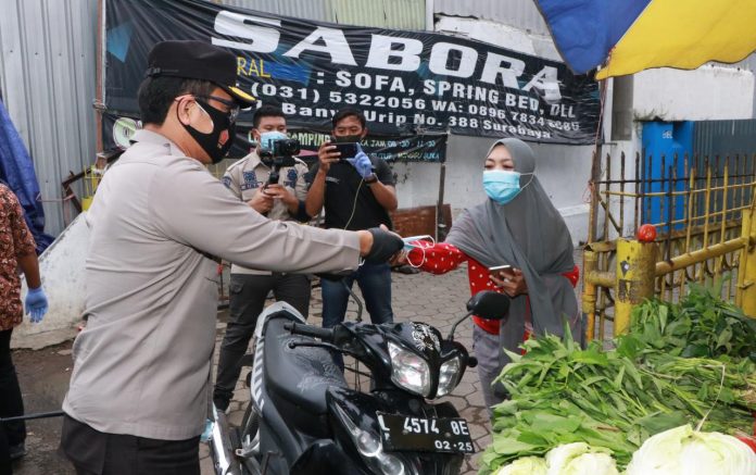 Dalam kegiatan ini, kapolda jatim tidak hanya membagikan masker, melainkan juga memakai kan masker secara langsung kepada masyarakat.