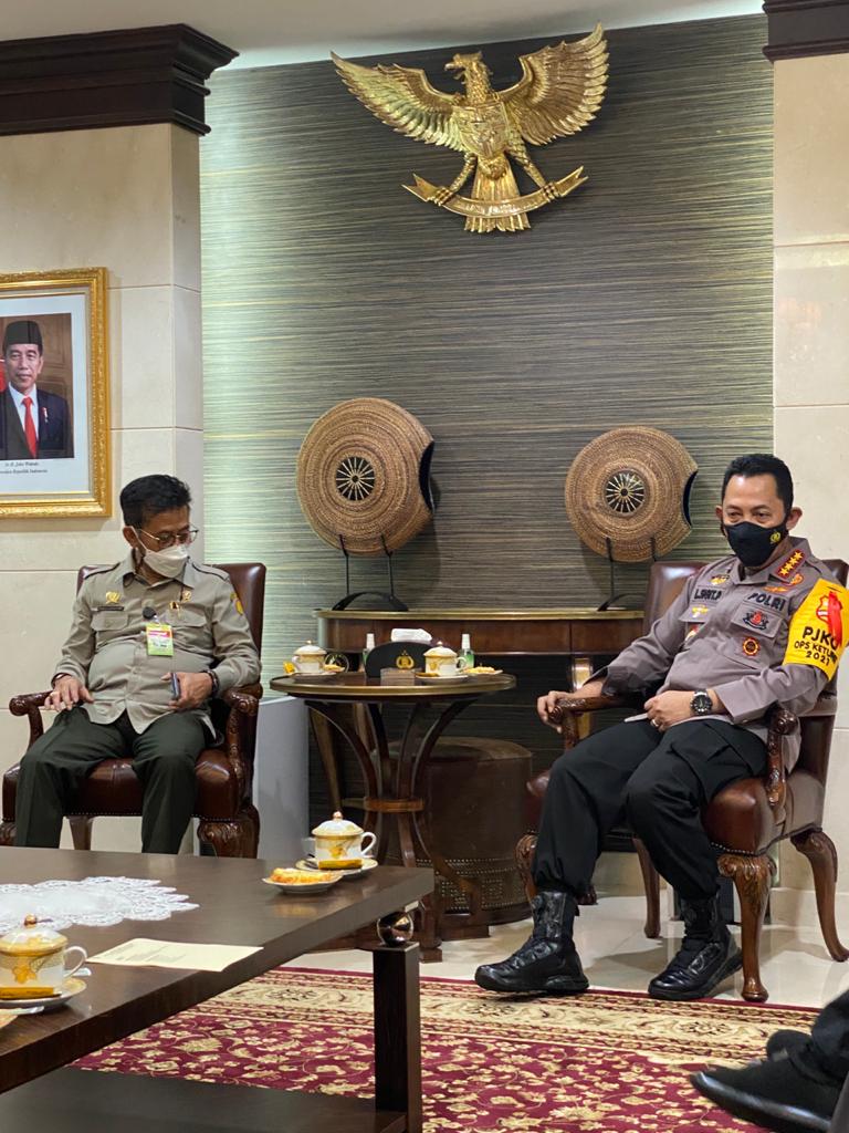 Jakarta—- Kapolri Jenderal Listyo Sigit Prabowo menerima audiensi Menteri Pertanian Syahrul Yasin Limpo bersama jajaran di Ruang Rapat Kapolri, Mabes Polri, Jakarta, Senin (17/5).