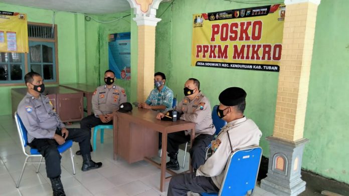 wacananews.com-polrestubanpoldajatim Upaya ciptakan kamtibmas aman kondusif dan cegah persebaran virus corona, Kapolsek Kenduruan AKP Budi Handoyo, S.H., bersama 3 anggota melaksanakan patroli sambang Posko PPKM Mikro Desa Sidomukti. Kamis (18/3/2021) pagi.