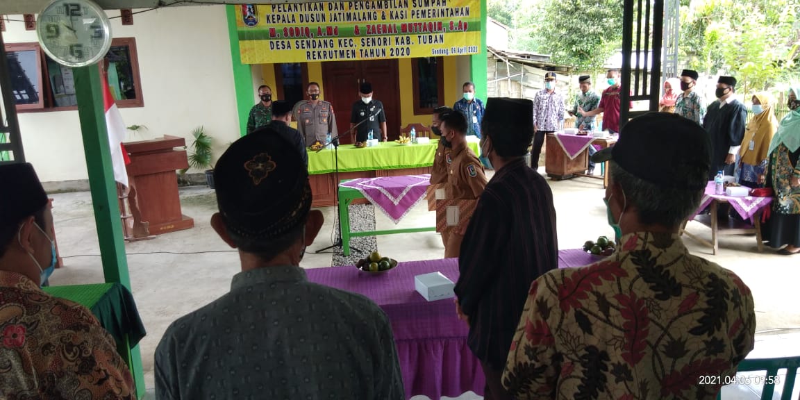 wacananews.com – PolresTubanJatim Kapolsek Senori Polres Tuban Iptu Suganda, S.H., menghadiri kegiatan pelantikan Perangkat Desa Sendang Kec, Senori. Dimana pada waktu tersebut M. Sodiq dilantik sebagai Kadus Jatimalang dan Zaenul Mutaqqin sebagai Kaur Tata Usaha dan Umum Desa Sendang, Kecamatan Senori, Selasa (6/4/2021)