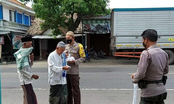 Upaya mencegah penyebaran Covid-19, Polsek Widang  membagian masker untuk warga, Sabtu (08/05/2021).