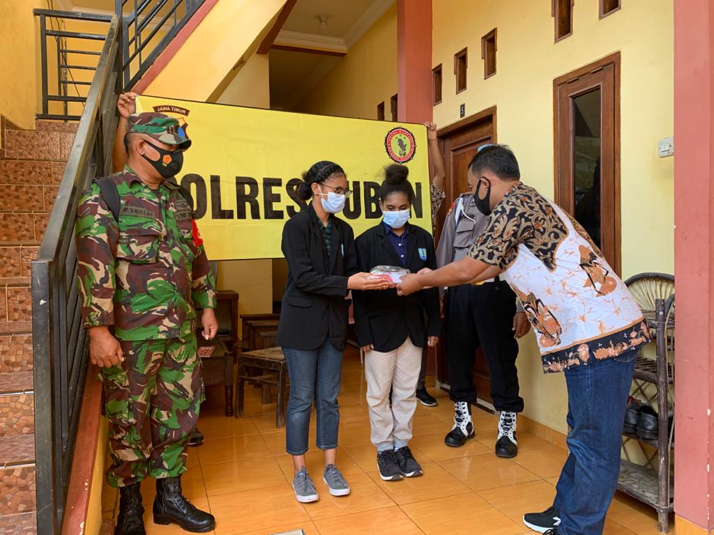 Selain melaksanakan Kunjungan kepada pelajar/warga Papua yang berada di Tuban, Polres Tuban melalui Kasat Intelkam juga membagikan 1000 masker serta 30 botol hand sanitizer.
