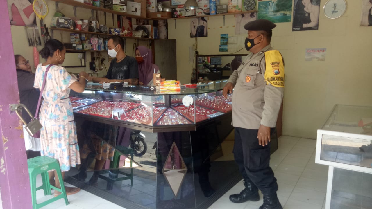 wacananews.com – PolresTubanPoldaJatim Polsek Bangilan Polres Tuban Polda Jatim – Petugas Regu jaga di bawah KSPKT I Aiptu Irianto melaksanakan patroli dan sambang ke toko emas di area pasar Bangilan, Rabu (16/6/2021).