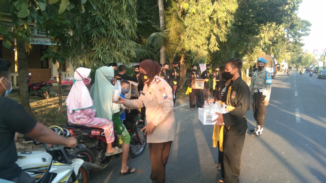 wacananews.com – PolresTubanJatim Menjelang waktu buka puasa hari kedelapan Bulan Suci Ramadan, Polsek Jatirogo Polres Tuban bersama Perguruan pencak silat PSH Winongo jatirogo membagikan takjil kepada warga di jalan raya barat jatirogo-bojonegoro. Selasa sore, (20/4/2021).