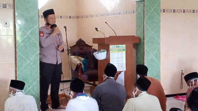 Sebelum pelaksanaan Sholat Jum’at, IPTU Tommy menyempatkan diri untuk naik ke mimbar memberikan beberapa pesan kepada para jama’ah, diantaranya untuk tetap menjalankan protokol kesehatan saat melaksanakan ibadah di masa pandemi.