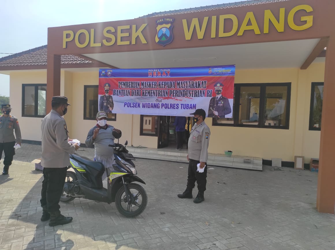 wacananews.com – PolresTubanJatim Berlokasi di Halaman Mapolsek Widang yang baru Desa Compreng, Kapolsek Widang AKP Totok Wijanarko, S.Pd., didampingi Wakilnya IPTU Ali Mas’ud, S.H., beserta anggota membagikan masker kepada warga masyarakat yang sedang beraktifitas, Kamis (06/05/2021).