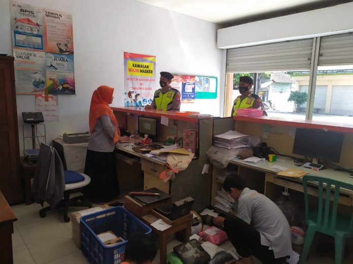 wacananews.com – PolresTubanJatim Anggota patroli polsek jenu polres Tuban melaksanakan Patroli sambang dan dialogis antisipasi 3C dan himbauan kepada petugas kantor pos Jenu tentang protokol kesehatan serta gerakan memakai masker.