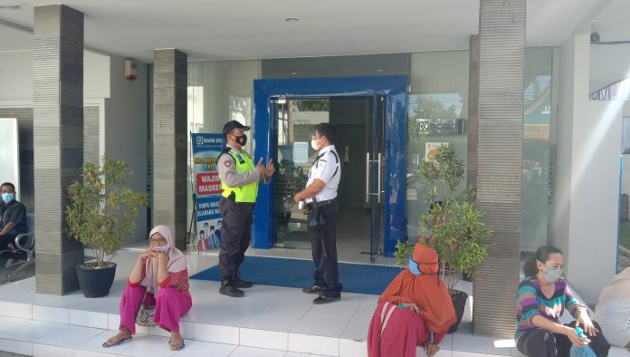 ” Kami juga ingatkan satpam agar mewajibkan nasabahnya agar tetap mematuhi Protokol Kesehatan dalam bertransaksi di Bank Jatim seperti Pakai Masker, jaga jarak maupun cuci tangan,” ucap Kanit Sabhara.