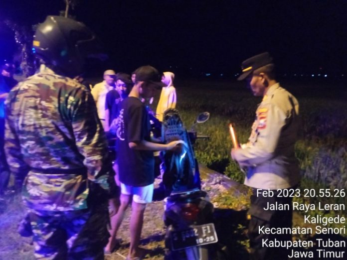 Dipimpin oleh Wakapolsek Senori Polres Tuban Ipda Joko Santoso, S.H., anggota gabungan melaksanakan patroli di titik-titik rawan terjadinya kriminalitas, tempat berkumpulnya para pemuda serta lokasi rawan terjadi gangguan Kamtibmas.