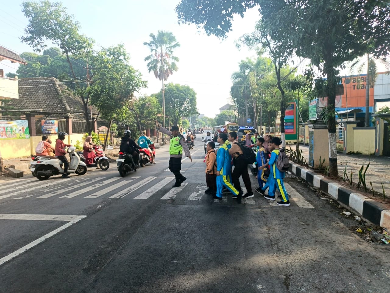 Anggota terlihat sigap mengatur kendaraan dan memastikan lalu lintas tetap berjalan lancar. Selain itu, mereka juga dengan penuh kesabaran membantu anak-anak sekolah yang menyeberang jalan, sehingga para pelajar dapat merasa aman dan nyaman saat menuju sekolah.
