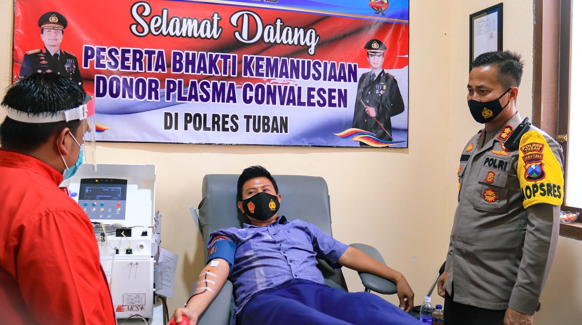 Kemarin siang, Rabu (03/02/2021) pukul 14.00 Wib, Bripka Agung Saputra anggota Satuan Intelkam Polres Tuban sesuai jadwal yang telah ditentukan akan mendonorkan plasma convalesennya. Ia merupakan pendonor pertama plasma convalesen dari Polres Tuban. Sebelum diambil Plasmanya, dilakukan pengecekan suhu terlebih dahulu dilanjutkan pengecekan tensi, dan anamnesa dokter. Setelah dinyatakan memenuhi syarat, proses pengambilan plasma bisa dimulai.