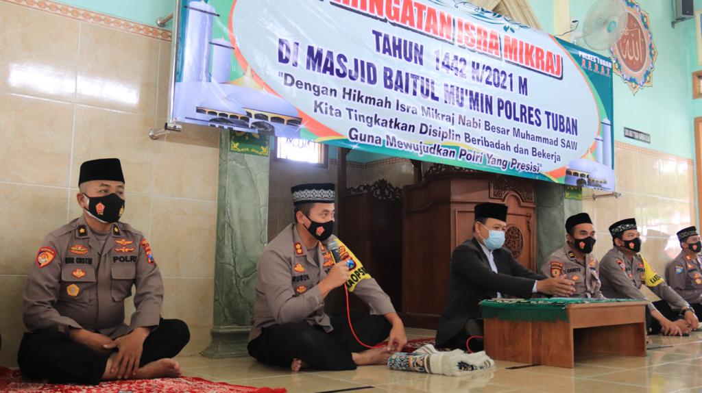 Tuban – Usai pelaksanaan sholat Dzuhur berjamaah, Kepolisian Resor Tuban gelar peringatan Isra Miraj Tahun 1442 Hijriyah di masjid Baitul Mu’min, Rabu (10/03/2021)