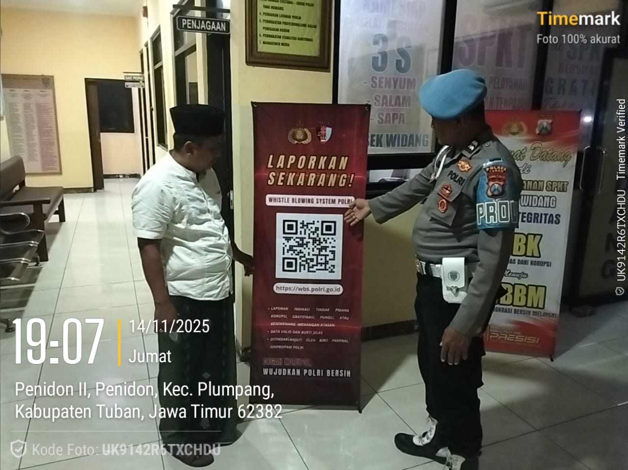 ” Jumat (14/11/2025) malam, Kanit Propam (Profesi dan Pengamanan Internal) Polsek Widang Aipda Achmad Erfan memasang banner WBS (Whistle Blowing System) di tempat pelayanan publik untuk memberikan kesempatan kepada masyarakat untuk melaporkan tindakan tidak terpuji atau penyalahgunaan wewenang oleh personel Polri.