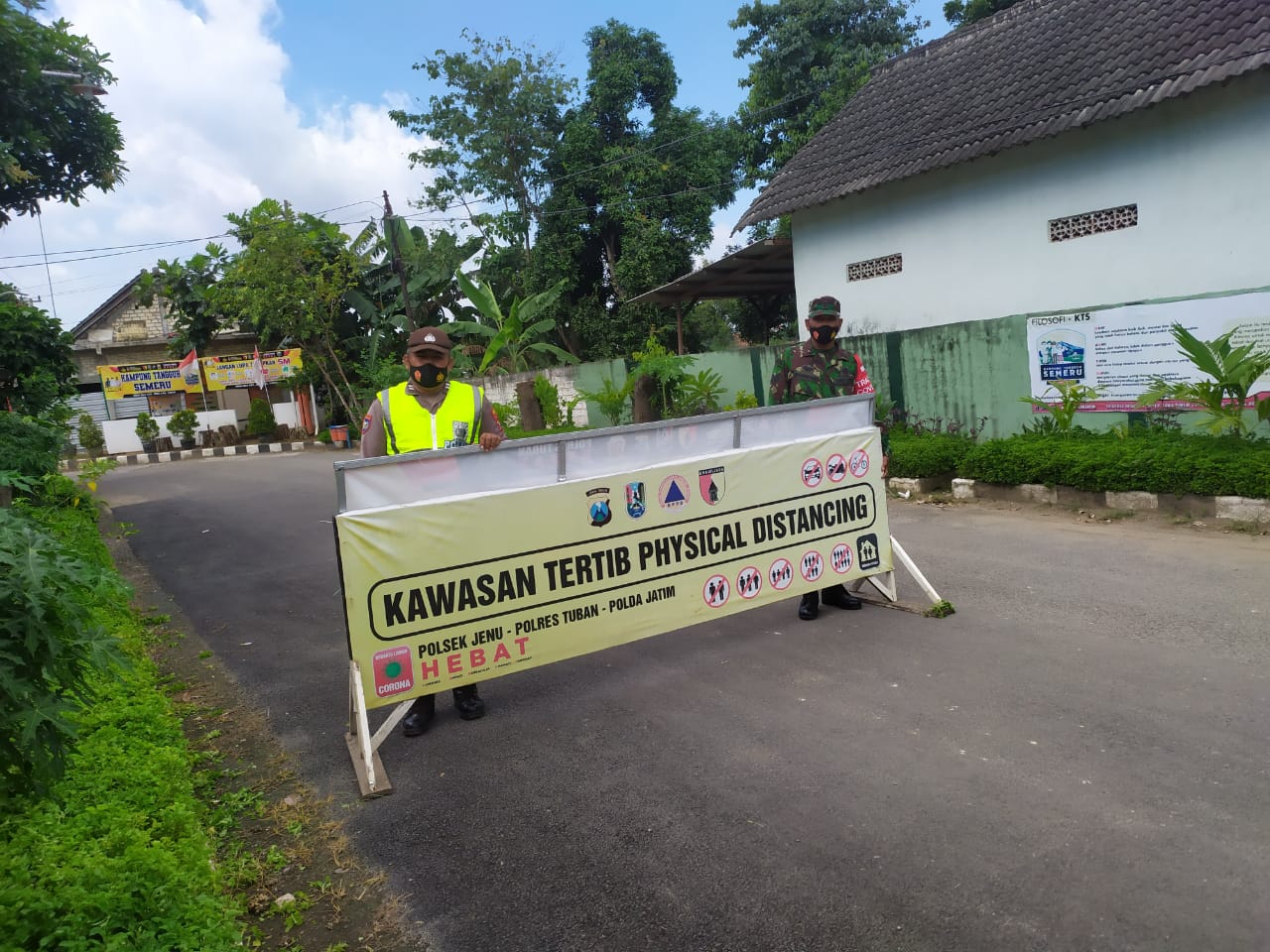 wacananews.com-polrestubanpoldajatim Mengingat Jenu zona orange maka polsek jenu, polres Tuban beserta Koramil Jenu melaksanakan giat physical distancing di pintu masuk perum Jenggolo,di maksudkan untuk membatasi setiap aktivitas kluar masuk tamu yg akan memasuki wilayah tersebut. Ini di harapkan dapat meminimalisir penyebaran Covid 19 di wilayah perum Jenggolo pada khususnya dan tidak timbul cluster keluarga di wilayah jenu.