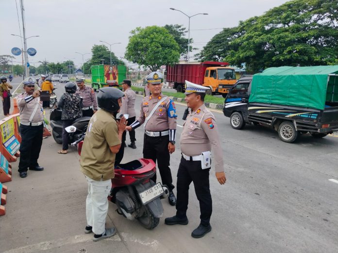 Petugas menyisir area jembatan untuk memantau arus lalu lintas sekaligus memberikan edukasi langsung kepada pengguna jalan.