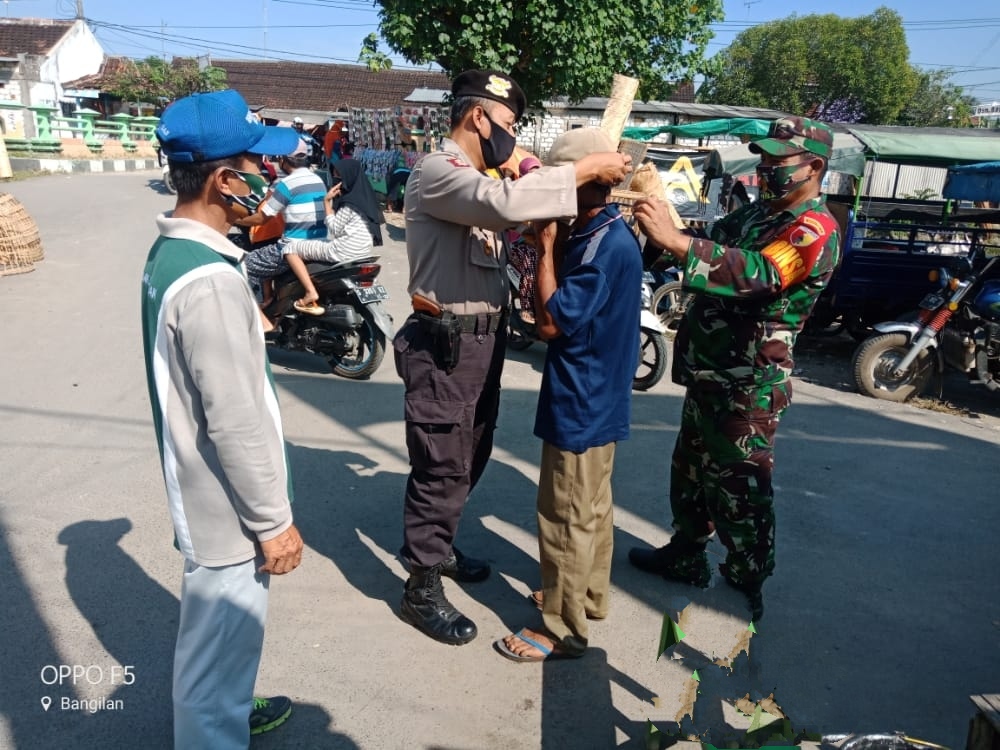 Untuk meminimalisir penyebaran Covid- 19 dan mewujudkan keamanan dan situasi kondusif di wilayah kecamatan Bangilan Kabupaten Tuban Petugas gabungan gencar melakukan pendisiplinan protokol kesehatan kepada pengunjung pasar, Minggu (2/5/2021).