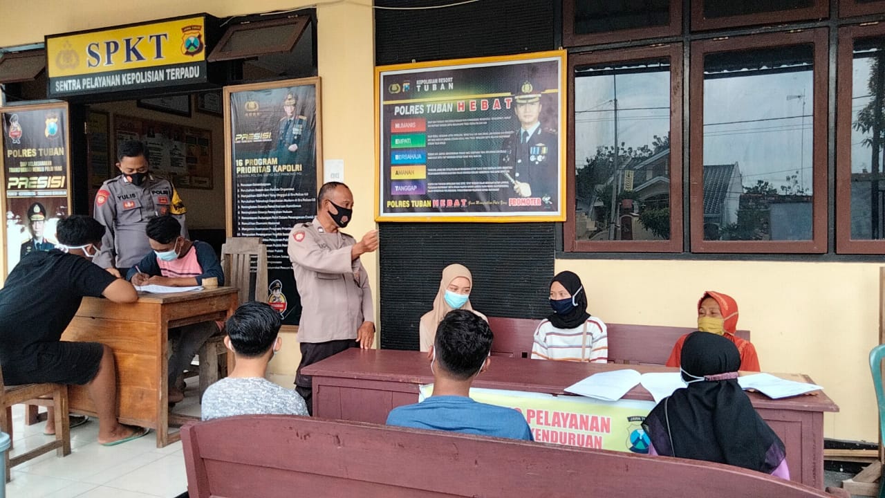 wacananews.com – PolresTubanPoldaJatim Ps. Kasium Polsek Kenduruan AIPTU Sugono memberikan himbauan protokol kesehatan covid-19 kepada para pemohon SKCK di ruang tunggu pelayanan Polsek Kenduruan, Senin (14/6/2021).