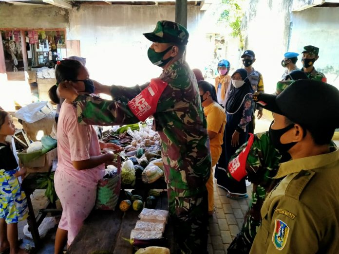 Nampak terlihat petugas giat Yustisi Protokol Kesehatan berada di jalan poros pasar tradisional Desa Sidomukti, sekaligus memberikan Himbauan untuk disiplin menerapkan Protokol Kesehatan utamanya memakai masker.
