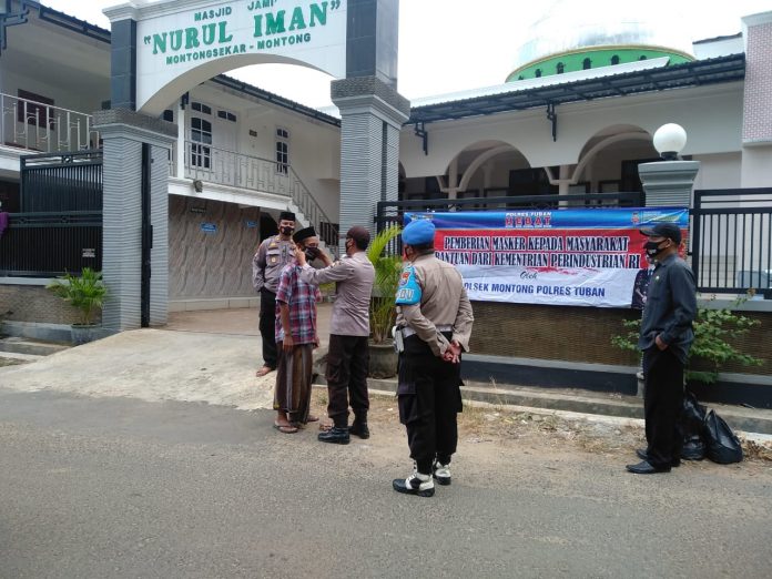 wacananews.com – PolresTubanJatim Polsek montong polres Tuban  terus berupaya menjaga dan meningkatkan kepatuhan warga masyarakat untuk mematuhi protokol kesehatan. Bertepatan dengan pelaksanaan sholat Jumat. Polsek Montong membagikan masker. Masker dibagikan kepada jamaah Salat Jumat di Masjid Nurul Iman desa Montongsekar kecamatan Montong Kabupaten Tuban, jumat, 7/5/2021