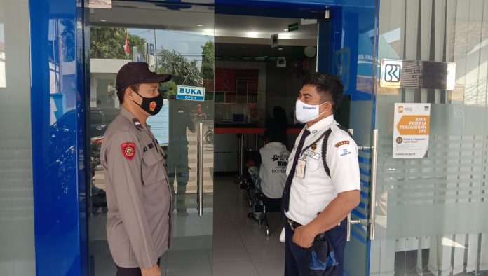” Kami juga ingatkan satpam agar mewajibkan nasabahnya agar tetap mematuhi Protokol Kesehatan dalam bertransaksi di Bank Jatim seperti Pakai Masker, jaga jarak maupun cuci tangan,” ucap Kanit Sabhara.