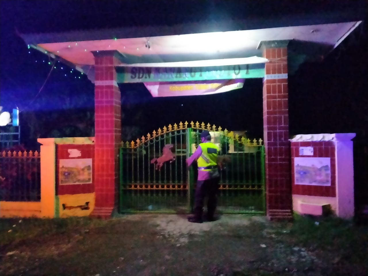 Pada kegiatan patroli kali ini, petugas menyambangi sejumlah gedung sekolah yang ada di pelosok-pelosok desa , salah satunya di SDN Karangtinoto Kecamatan Rengel Kabupaten Tuban. Rabu dini hari, (03/03/2021).