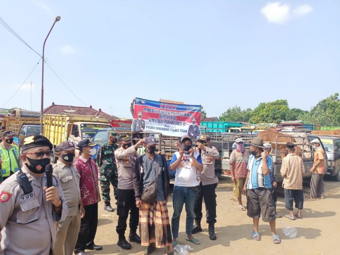 Semanding Bagikan Masker diPasar Hewan Tuban Cegah Penyebaran virus