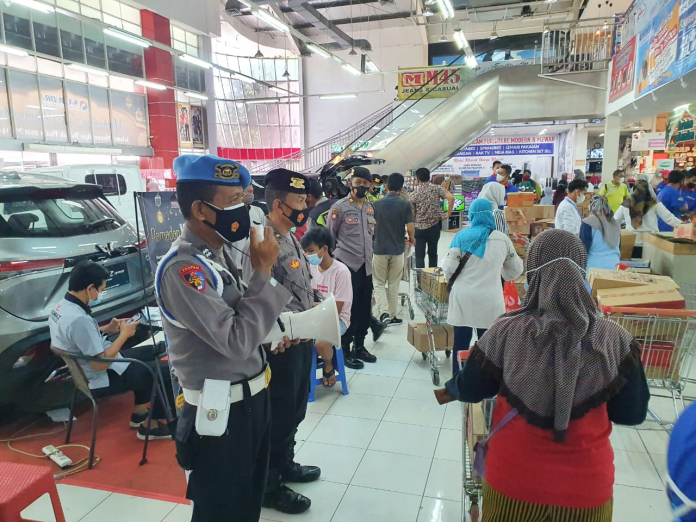 wacananews.com – PolresTubanJatim Pada hari Senin tanggal 03/05/2021, Waka Polsek Tuban Iptu Hartono SH memimpin langsung anggotannya melaksanakan giat Yustisi protokol kesehatan di beberapa swalayan yang ada di wilayah hukum Polsek Tuban.Seperti nampak dalam gambar Aiptu Sukir memberikan himbauan kepada pengunjung swalayan Samudra yang sedang melakukan aktifiats belanja.