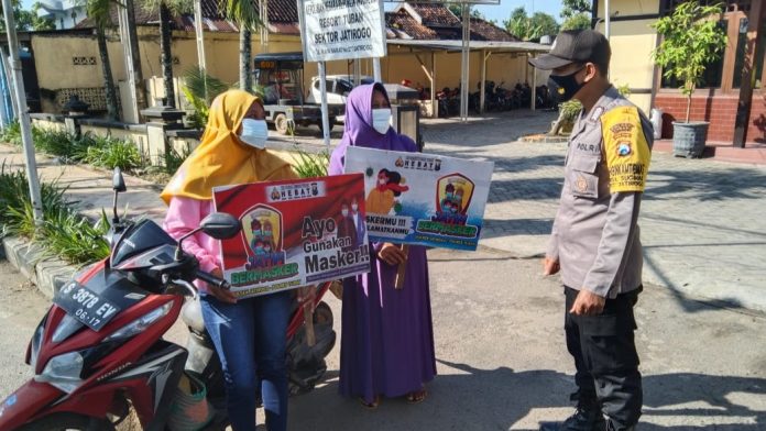 Dalam kegiatan tersebut anggota Polsek Jatirogo Aiptu Retno H., bersama Bripka Eko Hadi mengajak kepada masyarakat untuk selalu mematuhi protokol kesehatan dengan 5M yaitu mencuci tangan, memakai masker, menjaga jarak, menghindari kerumunan dan mengurangi mobilitas, untuk mencegah penyebaran Covid-19. “Kami berharap ditengah Pandemi Covid-19 ini masyarakat mematuhi himbauan pemerintah untuk selalu Disiplin Protokol Kesehatan” Tutur Retno