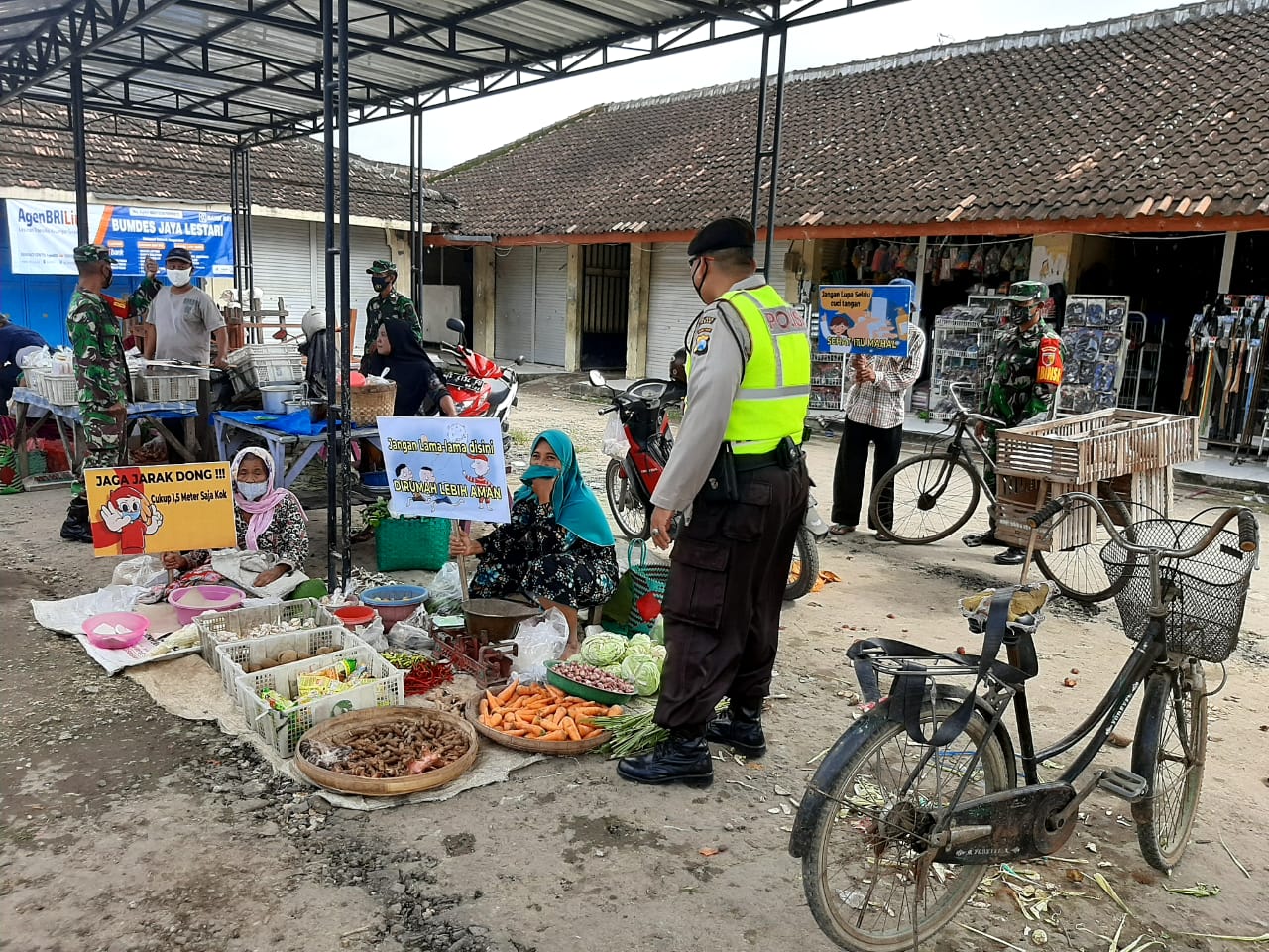 “Pasar menjadi tempat perkumpulan masyarakat yang sedang melakukan jual beli. Kami menghimbau para masyarakat untuk menggunakan masker dan apabila tidak memiliki masker kesehatan agar menggunakan masker dari kain guna mencegah terjadinya penularan virus covid-19,” kata Aipda Murdiantoro.