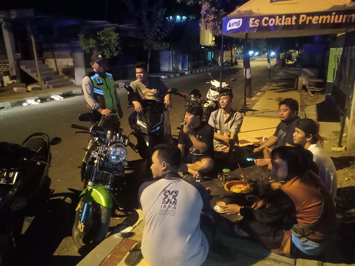 Senori – Dua Personil Polsek Senori Polres Tuban Polda Jatim Aiptu Sugeng Hariyanto dan Bripda Rifky Syahroni terlihat memberikan himbauan kamtibmas kepada komunitas pemuda yang sedang nongkrong di trotoar jalan Letda Sucipto Kecamatan Senori, Sabtu (25/10/2025) malam.
