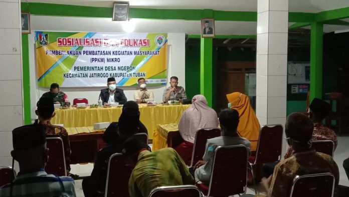 wacananews.com – PolresTubanJatim Dalam upaya penanggulangan wabah covid-19, bersama Forkopimka Waka Polsek Jatirogo IPTU Suhardi menghadiri sosialisasi dan edukasi PPKM Mikro bertempat di Balai Desa Ngepon Kec. Jatirogo Kab. Tuban. Kamis malam, (3/5/2021)