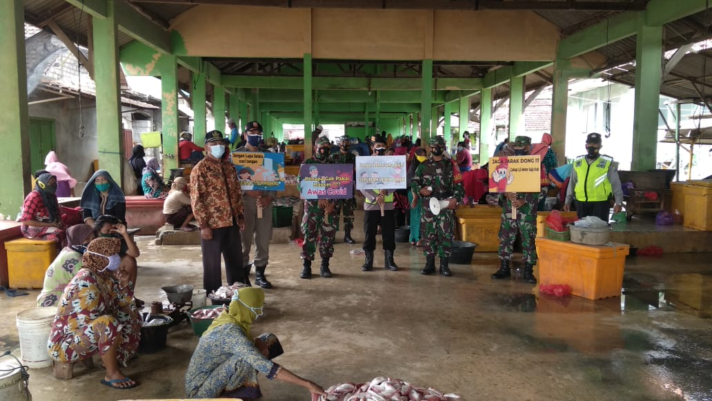 wacananews.com – PolresTubanPoldaJatim Personel Polsek Tambakboyo Polres Tuban dipimpin Aiptu Agung Cahyono bersama Brigadir Abd.Mukti Anggota Koramil Tambakboyo melakukan patroli dalam rangka pencegahan penyebaran virus Covid-19, di Pasar Ikan TPI Ds.Glondonggede Kec Tambakboyo, Senin, (8/2/2021)