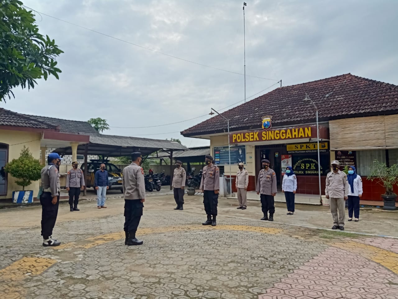 Seperti yang dilakukan oleh personil Polsek Singgahan Polres Tuban melaksanakan apel pagi dihalaman Mapolsek Singgahan. Selasa pagi (6/4/21)